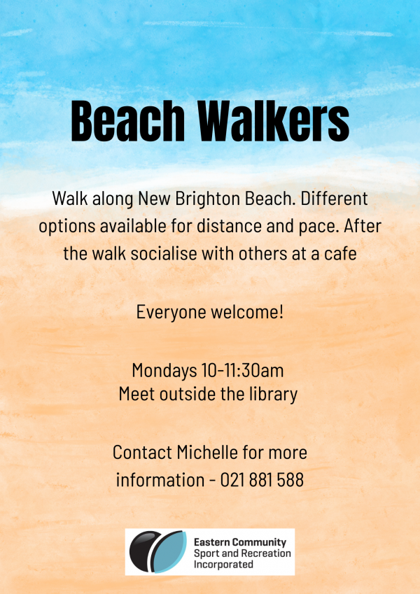 Beach Walkers with Michelle! Come along for a walk along New Brighton Beach and socialise at a cafe afterwards. Looking for more information? Contact Michelle on 021 881 588